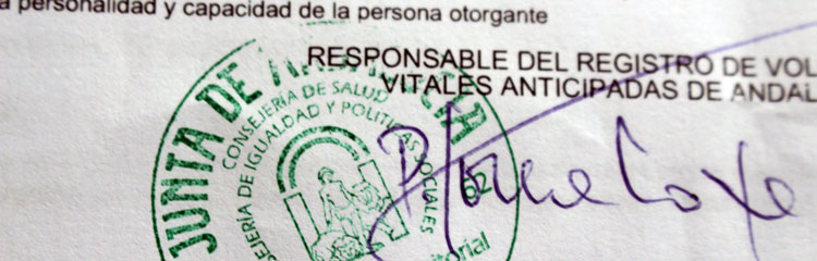 The registration of the living will is done by a specially designated official of the Junta de Andalucía. There are offices in Vélez-Màlaga, the Centro de Salud Las Lagunas in Mijas, the Hospital de Ronda, the hospital de Antequera and in Málaga in the Hospital Civil, Hospital Virgen de la Victoria and the Delegación Territorial de Salud.
